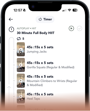 Maximize your 30-minute Daily Fit Sweats with autoplay HIIT circuits — it’s like having a coach in your pocket. Just hit Start and go! Everything’s timed and ready for you, no thinking or pausing required — just move, sweat, and feel amazing.